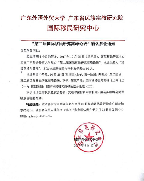 经过前期4个月的筹备,2017年10月25日(星期三),国际移民研究中心将在广东外语外贸大学举办“第二届国际移民研究高峰论坛”,论坛主题为“移民危机与管理”。本次论坛邀请国内外专家学者约60人。